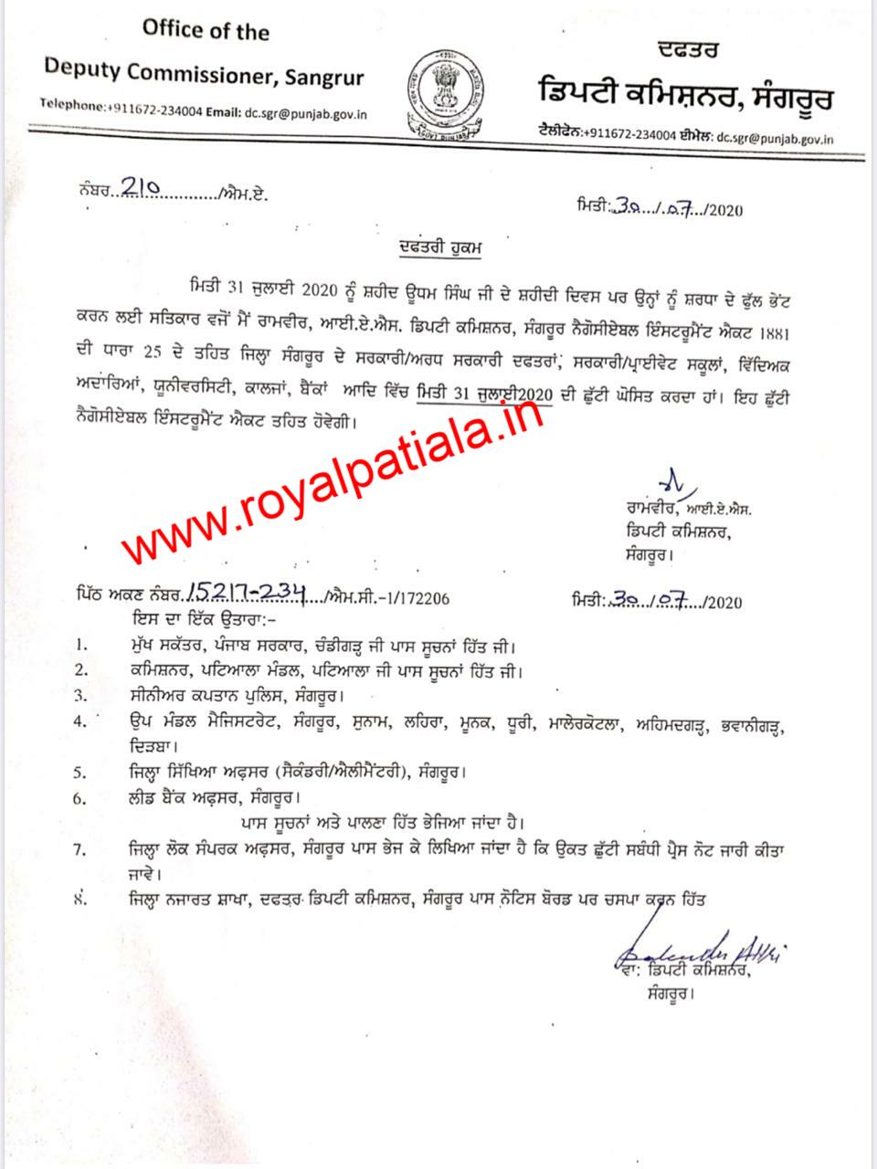 Dc Declares Holiday On July 31 Under Negotiable Instrument Act Royal Patiala Holidays are notified as public holidays under section 25 of the negotiable instruments act, 1881 (xxvi of 1881).